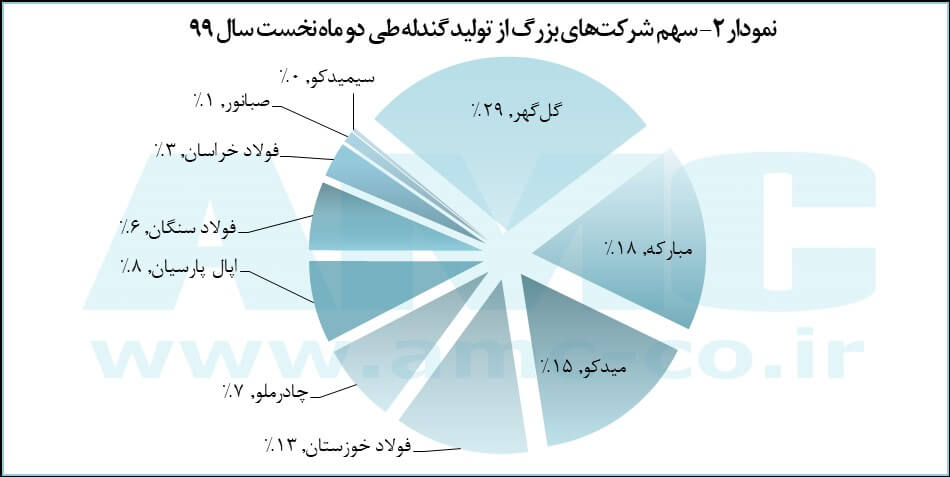 همانند سال‌های اخیر، بیشترین سهم تولید این محصول به شرکت معدنی و صنعتی گل‌گهر تعلق داشت. این شرکت توانست ۲۹ درصد از سهم تولیدگندله کشور را طی دو ماه نخست سال ۱۳۹۹ از آن خود کند. فولاد مبارکه نیز به عنوان دومین تولیدکننده، سهم ۱۸ درصدی در تولید  گندله کشور داشت.