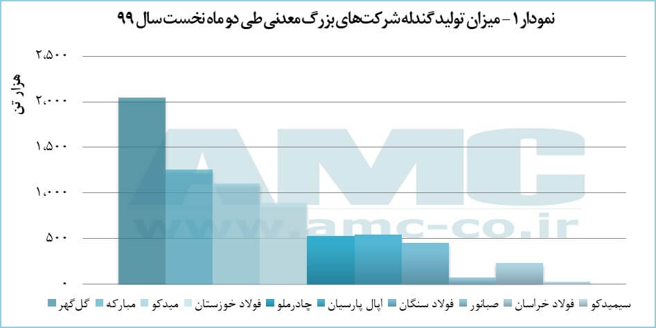 طی فروردین و اردیبهشت سال ۱۳۹۹، واحدهای بزرگ صنعتی کشور توانستند هفت میلیون و ۱۵۵ هزار و ۳۵۴ تن گندله تولید کنند اما در سال گذشته هفت میلیون و ۲۳۴ هزار و ۷۳۹ تن گندله تولید شده بود. به این ترتیب، تولیدگندله در کشور طی دو ماه نخست سال جاری یک درصد کاهش داشت. نمودار ۱ نشان می‌دهد که همانند سه سال گذشته، شرکت معدنی و صنعتی گل‌گهر بزرگ‌ترین تولیدکننده گندله در کشور باقی مانده است.