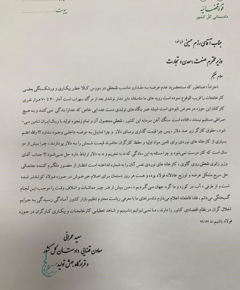 سعید عمرانی، معاون قضایی دادستان کل کشور در نامه ای به رزم حسینی نوشت: عدم عرضه به مقدار مناسب شمش (عرضه قطره چکانی شمش فولاد) در بورس کالا خطر و بیکاری و ورشکستی بعضی کارخانجات را قریب الوقوع کرده است و رویه های ما متاسفانه دایر مدار و نوشدارو بعد از مرگ سهراب است.