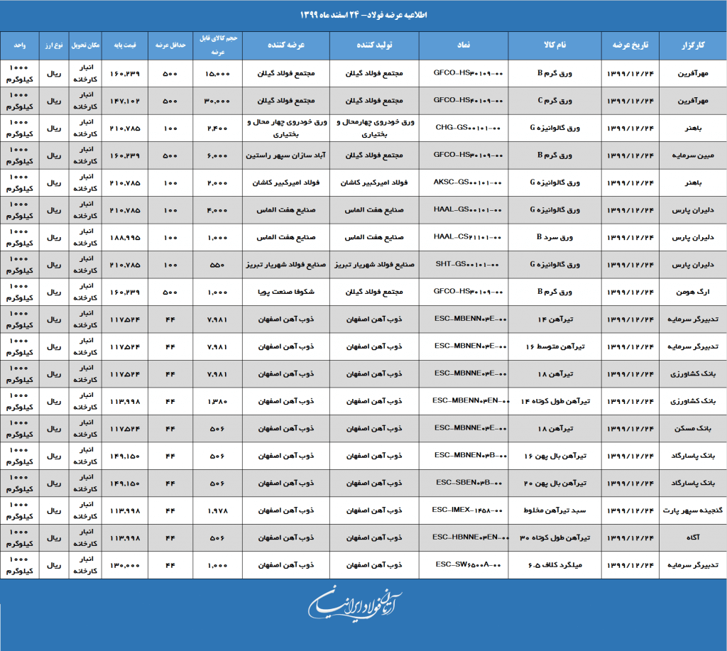 عرضه ورق های فولاد گیلان و صنایع هفت الماس و تیرآهن ذوب آهن اصفهان در بورس کالا در تاریخ ۲۴ اسفند ۹۹
