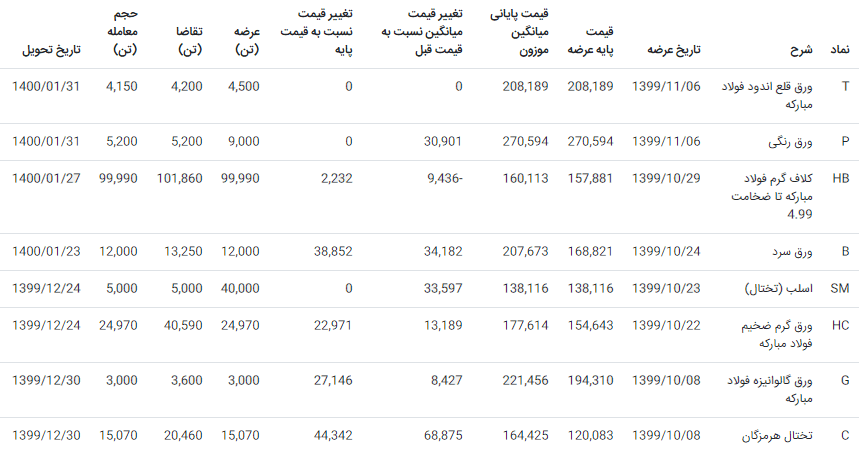 همانطور که قبلا اشاره شد برخی از کالاهای فولادی در بازار بورس کالا نیز معامله میشوند، در همین راستا ورق گالوانیزه نیز یکی از محصولات فولادی است که در بازار بورس مورد توجه قرار گرفته است. همانطور که در جدول بالا مشاهده میکنید، ورق گالوانیزه فولاد مبارکه اصفهان در بازار بورس کالا معامله میشود. در این جدول اطلاعاتی از قبیل قیمت پایه محصول، تغییرات قیمت، میزان عرضه و تقاضا نیز آورده شده است.