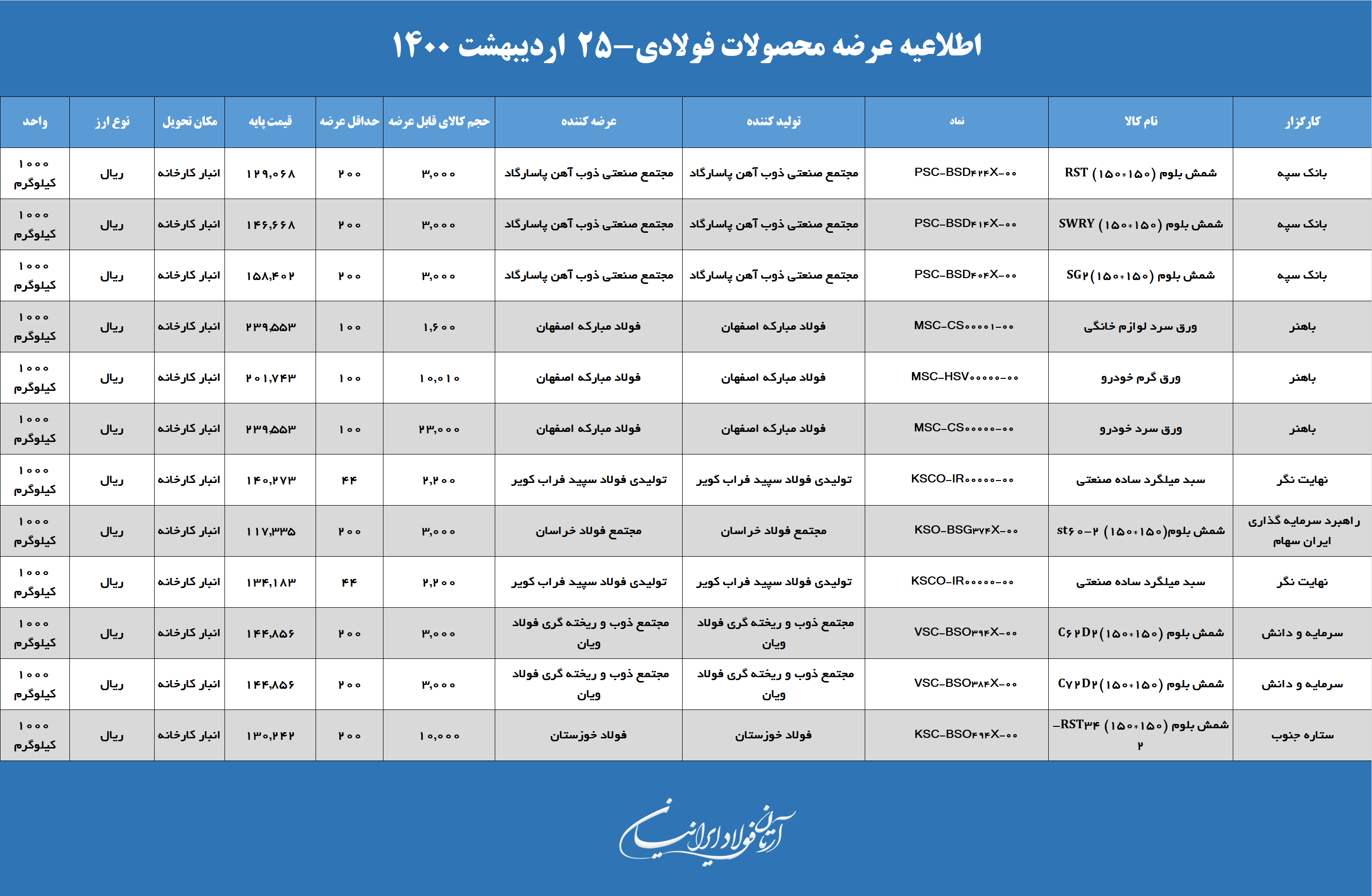 اطلاعیه عرضه محصولات فولادی در بورس کالا در تاریخ ۱۴۰۰/۰۲/۲۵