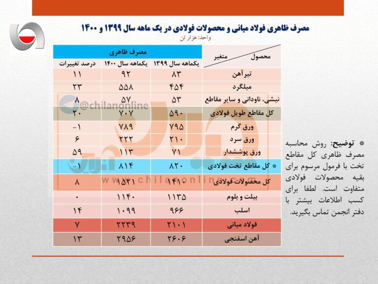 بر اساس گزارش آماری انجمن فولاد، مصرف ظاهری آهن و فولاد میانی (بیلت و بلوم و اسلب) با ۷ درصد رشد به ۲ میلیون و ۲۳۹ هزار تن رسید و مصرف ظاهری کل محصولات فولادی با ۸ درصد رشد نسبت به مدت مشابه سال قبل به ۱ میلیون و ۵۲۱ هزار تن رسید.