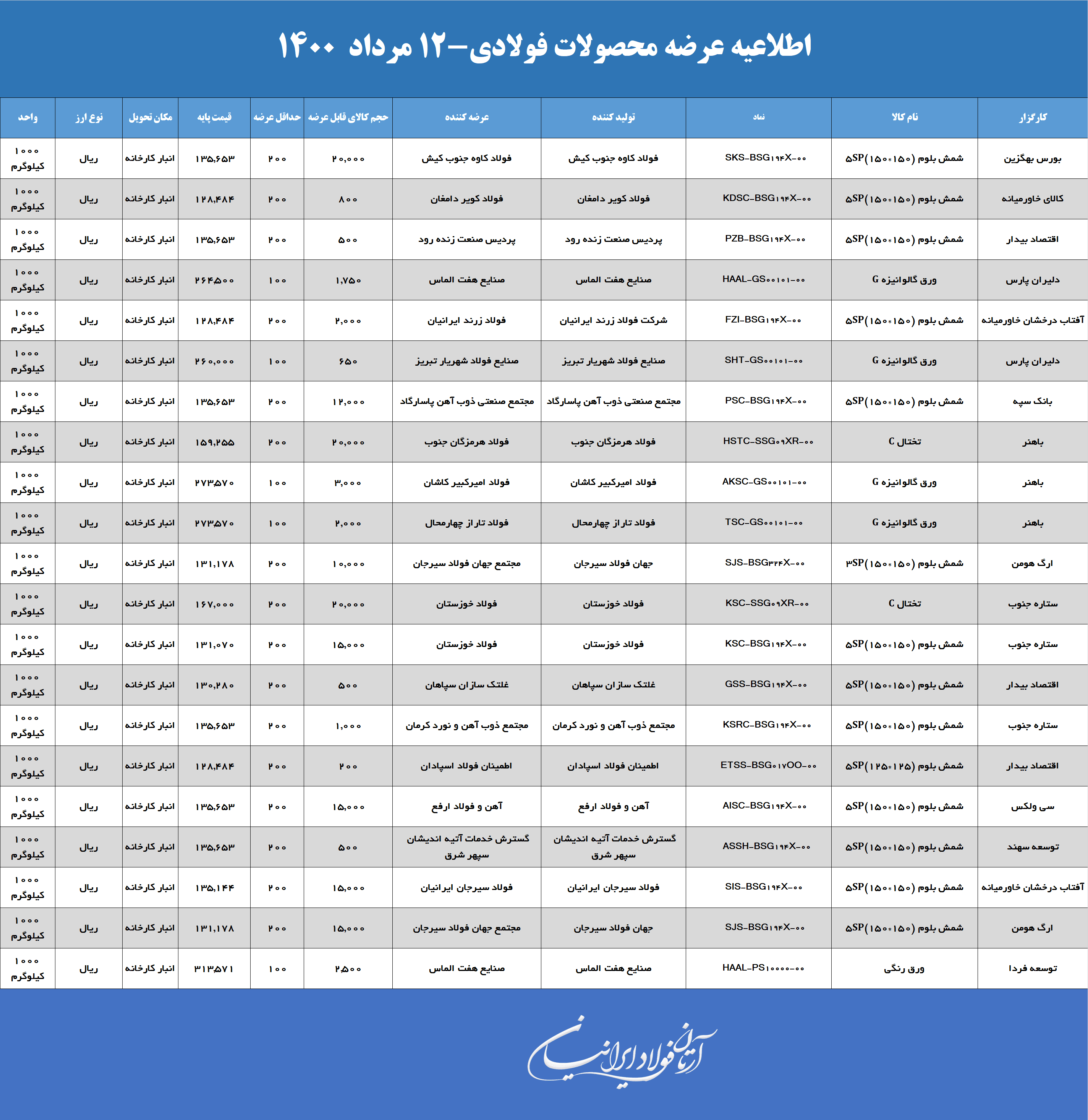 امروز قرار است در مجموع ۱۰۷،۵۰۰ تن شمش با نرخ میانگین موزون ۱۳۳،۶۷۷ ریال ( حدود ۱۴،۵۷۰ تومان +vat ) در بورس کالا عرضه شود.