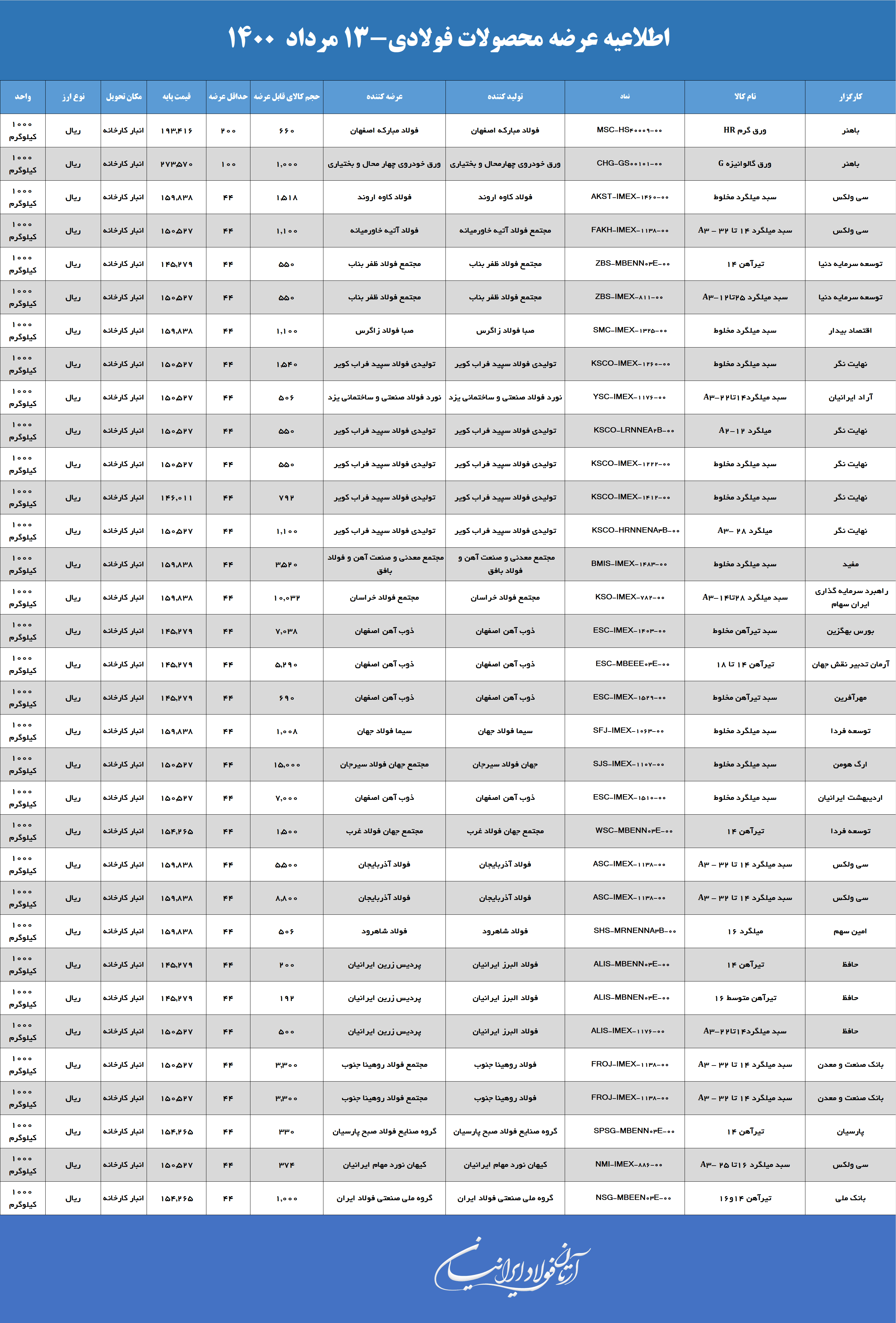 اطلاعیه عرضه انواع محصولات فولادی در بورس کالا در روز چهارشنبه ۱۴۰۰/۰۵/۱۳