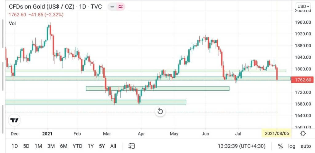 به خوبی می توان تغییر روند معاملات طلا جهانی را در نمودار زیر مشاهده کرد. از نمودار معاملات طلا می توان این موضوع را استنباط کرد که هر زمان کندل سنگین منفی در بازار رخ داد این موضوع با چند کندل منفی دیگر حمایت شده است. به این اصطلاح در بازار اصطلاحا چسبندگی قیمت به روند معاملات گفته می شود. در خصوص طلا نیز این سناریو بسیار محتمل است. با توجه به اینکه ریسک اقتصادی کرونا در بسیاری از کشورهای بزرگ دنیا کمرنگ شده و از طرفی فدرال رزرو قصدی برای حمایت از نرخ طلا ندارد شاهد این افت به صورت پایدار در قیمت جهانی طلا خواهیم بود. این موضوع در صورتی که به افت دلار در ایران همراستا شود می تواند نرخ طلای ایران را نیز قدری کاهش دهد.