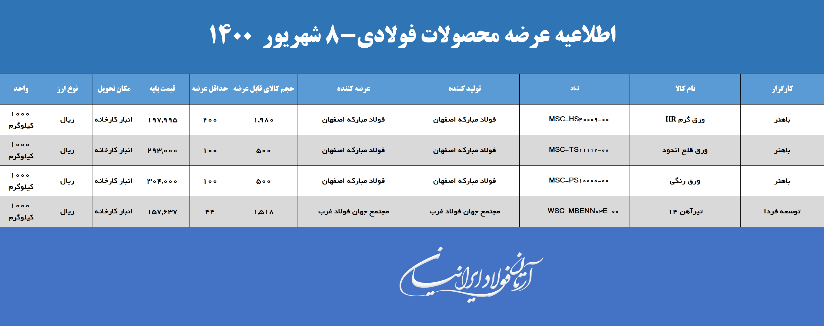 اطلاعیه اولیه عرضه ورق فولاد مبارکه روز دوشنبه مورخ