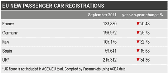 با توجه به اطلاعات منتشر شده در اخبار متال بولتن میزان ثبت نام خودروهای سواری در اتحادیه اروپا در ماه سپتامبر سال ۲۰۲۱ در جدول زیر آورده شده است و نسبت به مدت مشابه در سال قبل مقایسه شده است.