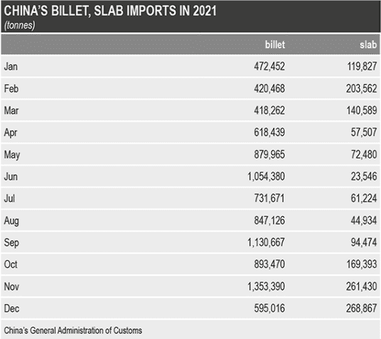 جدول زیر میزان واردات بیلت فولادی و اسلب فولادی به چین را در سال ۲۰۲۱ نشان می دهد.