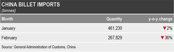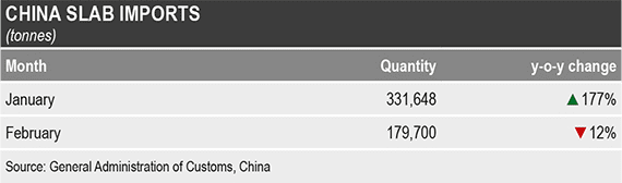 داده های منتشر شده در ۲۱ مارس توسط اداره کل گمرک نشان می دهد که چین در دو ماه ابتدای سال جاری (از ژانویه تا فوریه) بیلت کمتری وارد کرده، اما تقاضای بیشتری برای اسلب وارداتی داشته است.