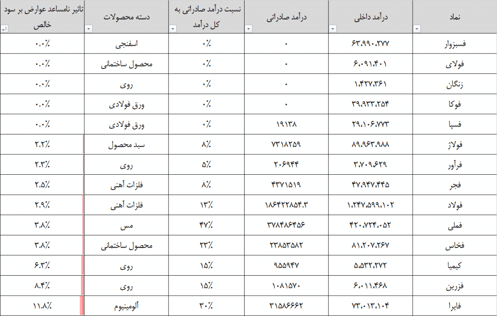 اگر فرض کنیم که عوارض صادراتی در یک سال کامل بر شرکت های فولادی مورد اشاره لحاظ می شد، تاثیر منفی آن بر سود خالص ۰ الی ۱۱.۸ درصد خواهد بود.