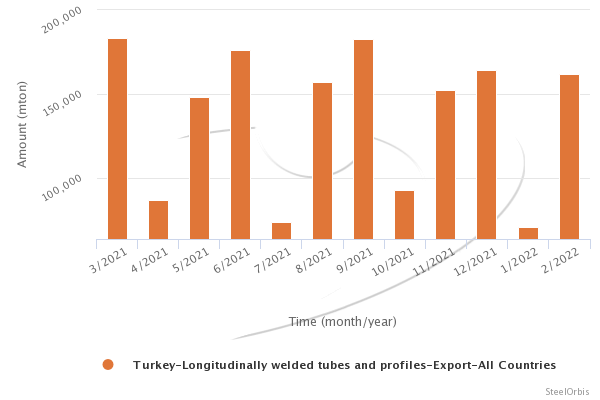 بر اساس داده های ارائه شده توسط موسسه آماری ترکیه (TUIK) در فوریه امسال، کل صادرات لوله و پروفیل های طولی ترکیه با ۱۲۷.۶ درصد افزایش نسبت به ژانویه به ۱۶۱۷۷۷ تن رسید و نسبت به سال قبل ۳۶.۱ درصد افزایش یافت. ارزش این صادرات ۱۹۱.۷ میلیون دلار بوده که نسبت به ماه فوریه ۱۴۰.۹ درصد رشد و نسبت به فوریه ۲۰۲۱ حدود ۱۱۷.۴ درصد افزایش داشته است.