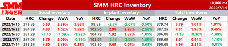 منابع خبری گزارش دادند کل موجودی کویل نورد گرم در انبارهای اجتماعی و سازندگان فولاد در چین تا ۱۴ ژوئیه به ۳.۹۹ میلیون تن رسید که ۸۹۸۰۰ تن یا ۲.۳۱ درصد نسبت به هفته گذشته افزایش داشت و ۰.۱ درصد نسبت به سال قبل کاهش داشته است.