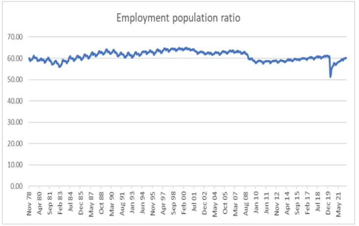 به نقل از منابع خبری، جالب اینجاست که در دوره کنونی تورم گزارش های زیادی از کمبود نیروی کار وجود دارد. اما وقتی به نسبت اشتغال به جمعیت نگاه کنیم، می بینیم مقدار بسیار پایینی دارد. این می تواند نشان دهد که نرخ مشارکت در اشتغال پایین است و شاید با افزایش تورم مردم دوباره به بازار کار بازگردند.