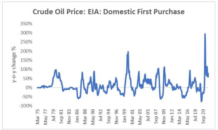 شکل زیر درصد تغییرات سالانه قیمت نفت خام در امریکا را بر اساس داده های منتشر شده از اداره اطلاعات انرژی امریکا (EIA) نشان می دهد.