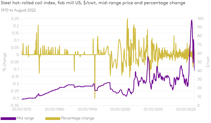 شکل زیر درصد تغییرات قیمت کویل نورد گرم فولادی ایالات متحده را از سال ۱۹۷۰ تا ۲۰۲۲ نشان می دهد.