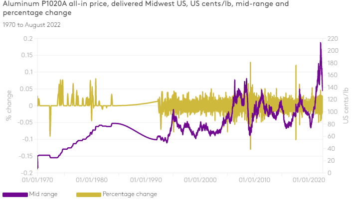 شکل زیر نیز درصد تغییرات قیمت آلومینیوم در ایالات متحده را از سال ۱۹۷۰ تا ۲۰۲۲ نشان می دهد.
