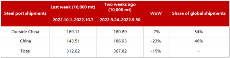 فعالان بازار اعلام کردند میزان محموله های فولادی ارسال شده از بنادر خارج از چین در هفته اول اکتبر ۱.۶۹ میلیون تن بود که ۷ درصد کمتر از هفته آخر سپتامبر بوده است. بررسی ها نشان داد میزان صادرات محموله های فولادی توسط بنادر چین در هفته اول اکتبر ۱.۴۴ میلیون تن بود که کاهش ۲۳ درصدی را به صورت هفتگی نشان می دهد.