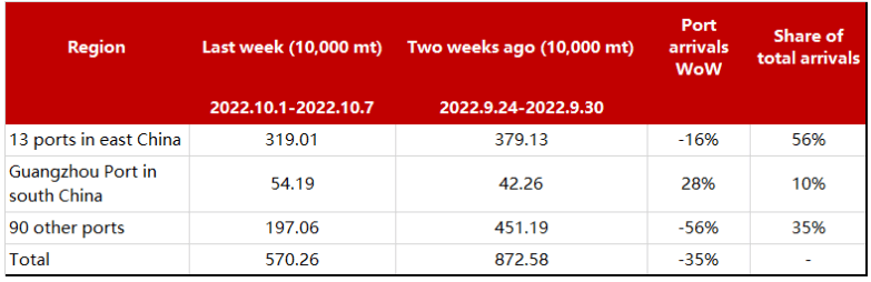 همچنین بررسی ها نشان داد مجموع میزان محموله های فولادی وارد شده از ۱۳ بندر اصلی در شرق چین در هفته اول اکتبر ۳.۱۹ میلیون تن بوده است که ۵۶ درصد از کل محموله های ورودی را تشکیل می دهد.