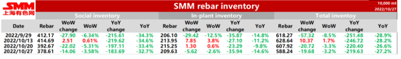 در جدول زیر موجودی میلگرد فولادی چین در انبارهای عمومی و انبار کارخانه های تولید کننده فولاد از ۲۹ سپتامبر تا ۲۷ اکتبر آورده شده است.