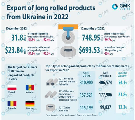 با توجه به محاصره بنادر، مشکلات لجستیکی و همچنین تخریب کارخانه های بزرگ در اوکراین، میزان صادرات محصولات فولادی طویل از اوکراین در دسامبر ۲۰۲۲ کاهش یافت.