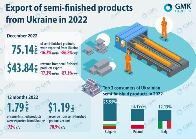 فعالان بازار در روز دوشنبه (۲۳ ژانویه) اعلام کردند صادرات محصولات فولادی نیمه تمام از اوکراین در سال ۲۰۲۲ بالغ بر یک میلیون و ۸۹۹ هزار تن بوده که نسبت به مدت مشابه در سال قبل ۷۲ درصد کاهش داشته است. همچنین بررسی ها نشان می دهد از نظر پولی نیز، صادرات محصولات فولادی نیمه تمام از اوکراین با ۷۰.۹ درصد کاهش در سال در ۱۲ ماه سال ۲۰۲۲ به ۱.۱۹ میلیارد دلار رسیده است.