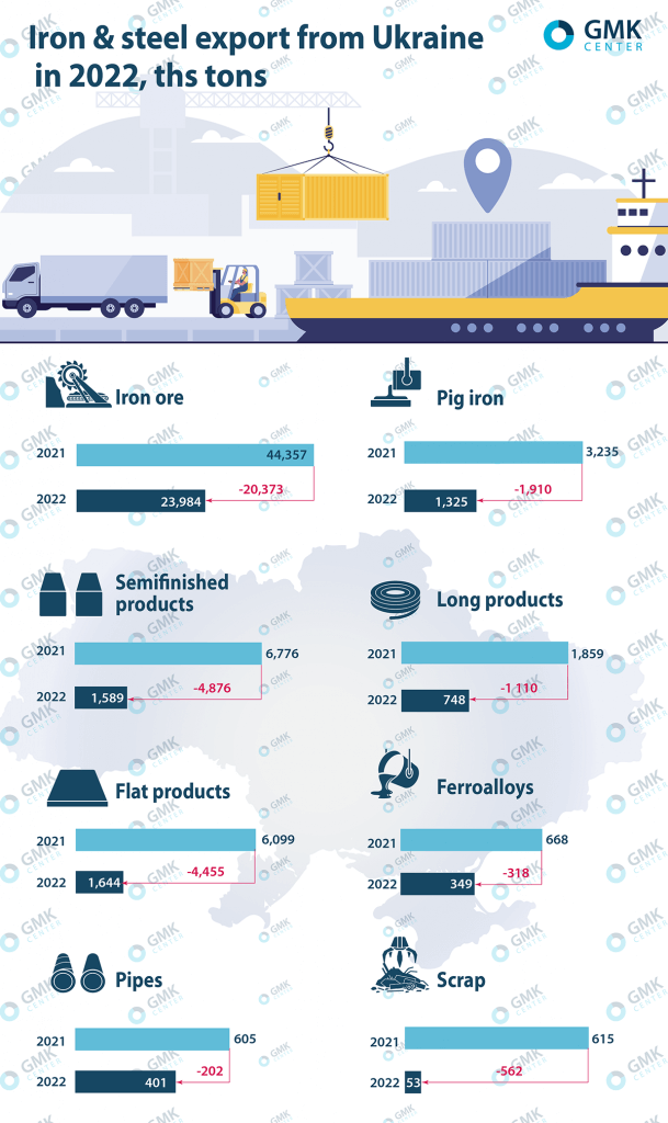 به گزارش آرتان پرس و به نقل از GMK، آمار رسمی منتشر شده توسط گمرک در روز دوشنبه (۳۰ ژوئیه) نشان داد، در سال ۲۰۲۲، میزان سنگ آهن صادر شده از اوکراین حدود ۴۶ درصد نسبت به سال ۲۰۲۱ کاهش یافته است. این در حالی است که میزان آهن خام صادر شده از اوکراین نیز در سال ۲۰۲۲ حدود ۵۹ درصد نسبت به سال ۲۰۲۱ افت داشته است. از طرفی بررسی ها نشان داد اوکراین صادرات محصولات فولادی نیمه تمام خود را در سال ۲۰۲۲ حدود ۷۲ درصد نسبت به سال ۲۰۲۱ کاهش داده است.