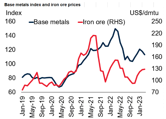 قیمت فلزات که در اوایل سال ۲۰۲۳ اندکی افزایش یافته بود، انتظار می‌ رود تا ۸ درصد نسبت به سال گذشته کاهش یابد. باید توجه داشت که کاهش قیمت فلزات عمدتاً به دلیل تقاضای ضعیف جهانی و بهبود عرضه‌ ها خواهد بود.