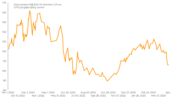نمودار زیر شاخص سنگ آهن فاین ۶۲ درصد وارداتی به شمال چین را از ژانویه ۲۰۲۲ تا آوریل ۲۰۲۳ نشان می دهد.