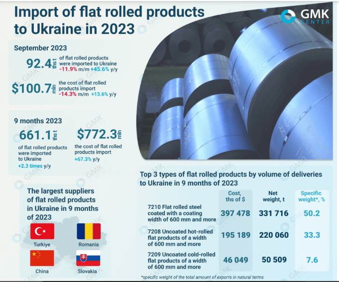 به نقل از چندین منبع خبری، بر اساس نتایج ژانویه تا سپتامبر ۲۰۲۳، اوکراین ۶۶۱.۱ هزار تن محصولات فولادی تخت نورد شده وارداتی به ارزش ۷۷۲.۳ میلیون دلار مصرف کرده است. بررسی ها نشان می دهد هزینه واردات محصولات فولادی تخت نورد شده از کشورهای خارجی به اوکراین در ۹ ماه نخست ۲۰۲۳ نسبت به مدت مشابه سال قبل ۶۷.۳ درصد و حجم تحویل ۲.۳ برابر افزایش یافته است.