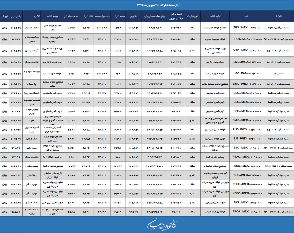 در این آمار اطلاعاتی همچون نوع محصول، تولید کننده و عرضه کننده، قیمت پایه عرضه، کمترین، بیشترین و قیمت پایانی میانگین موزون، حجم عرضه و تقاضا، واحد خرید و فروش، تاریخ تحویل کالا، کارگزار و چندین پارامتر دیگر بر روزسانی میگردد.