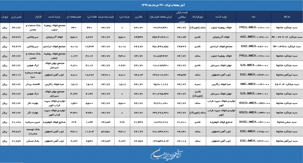 در این آمار اطلاعاتی همچون نوع محصول، تولید کننده و عرضه کننده، قیمت پایه عرضه، کمترین، بیشترین و قیمت پایانی میانگین موزون، حجم عرضه و تقاضا، واحد خرید و فروش، تاریخ تحویل کالا، کارگزار و چندین پارامتر دیگر بر روزسانی میگردد.
