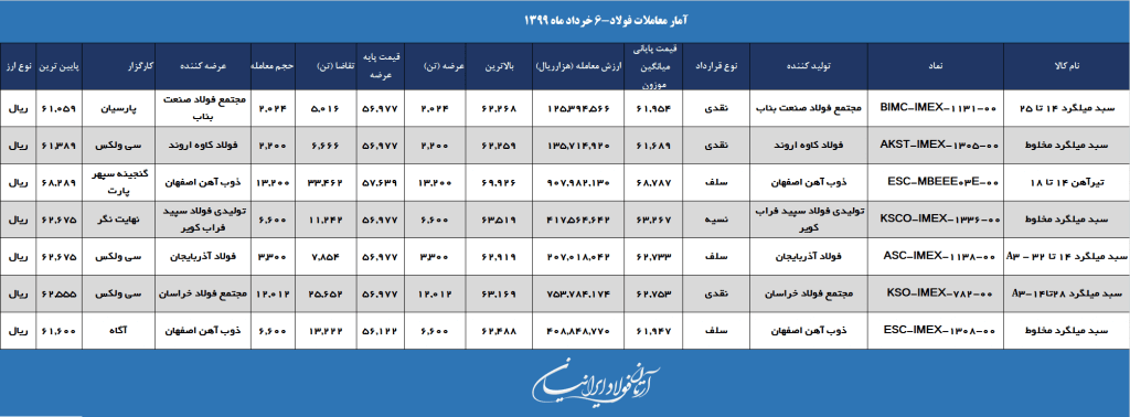 در این آمار اطلاعاتی همچون نوع محصول، تولید کننده و عرضه کننده، قیمت پایه عرضه، کمترین، بیشترین و قیمت پایانی میانگین موزون، حجم عرضه و تقاضا، واحد خرید و فروش، تاریخ تحویل کالا، کارگزار و چندین پارامتر دیگر بر روزسانی میگردد.